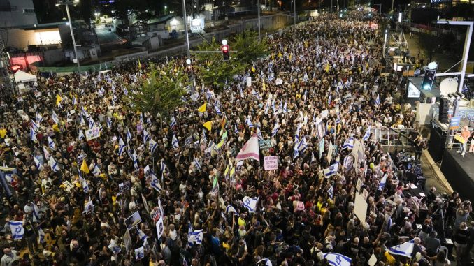 Χιλιάδες Ισραηλινοί βγήκαν χθες το βράδυ για ακόμη μια φορά στους δρόμους στο Τελ Αβίβ για να καταγγείλουν πως δεν κλείνεται συμφωνία ανάμεσα στην κυβέρνηση του Ισραήλ και τη Χαμάς που θα επιτρέψει να επιστρέψουν οι δεκάδες όμηροι που παραμένουν στη Λωρίδα της Γάζας στον θύλακο από την 7η Οκτωβρίου 2023.