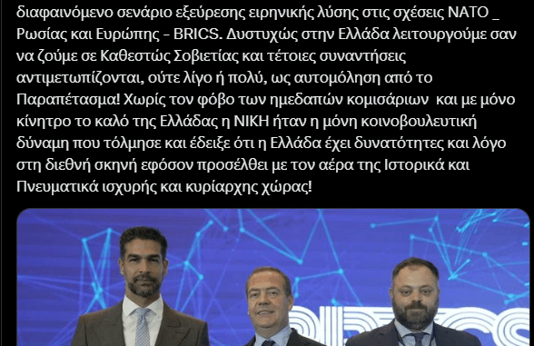 “Ξαφνικά όλοι ασχολούνται με την παρουσία της #ΝΙΚΗ στη διημερίδα #BRICS_EUROPE στο #Sochi. Θυμίζω ότι Βουλευτές από όλη την Ευρώπη, όπως Γερμανία, Γαλλία ακόμη και το Ηνωμένο Βασίλειο συναντήθηκαν με ομολόγους τους από τις χώρες που απαρτίζουν τις #BRICS δηλαδή τη Ρωσία, την Κίνα, την Ινδία, την Βραζιλία και την Νότια Αφρική. Όλες οι Ευρωπαϊκές χώρες, ασχέτως του υφιστάμενου κλίματος, ενδιαφέρονται για την επόμενη μέρα μετά την εκλογή Τραμπ και το διαφαινόμενο σενάριο εξεύρεσης ειρηνικής λύσης στις σχέσεις ΝΑΤΟ _ Ρωσίας και Ευρώπης – BRICS. Δυστυχώς στην Ελλάδα λειτουργούμε σαν να ζούμε σε Καθεστώς Σοβιετίας και τέτοιες συναντήσεις αντιμετωπίζονται, ούτε λίγο ή πολύ, ως αυτομόληση από το Παραπέτασμα! Χωρίς τον φόβο των ημεδαπών κομισάριων και με μόνο κίνητρο το καλό της Ελλάδας η ΝΙΚΗ ήταν η μόνη κοινοβουλευτική δύναμη που τόλμησε και έδειξε ότι η Ελλάδα έχει δυνατότητες και λόγο στη διεθνή σκηνή εφόσον προσέλθει με τον αέρα της Ιστορικά και Πνευματικά ισχυρής και κυρίαρχης χώρας!”