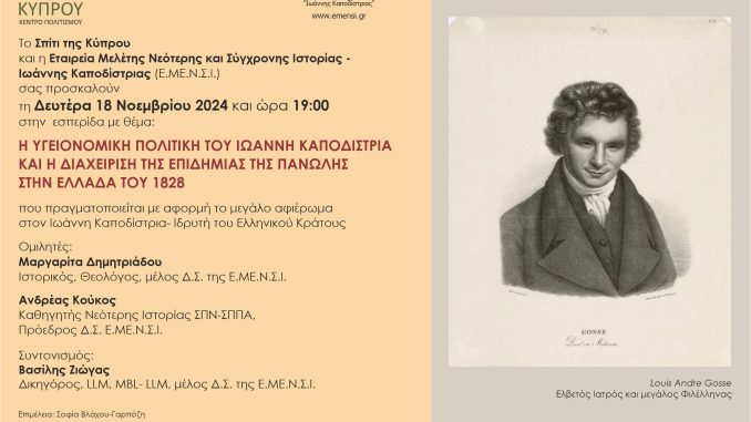 Το Σπίτι της Κύπρου και η Εταιρεία Μελέτης Νεότερης και Σύγχρονης Ιστορίας-Ιωάννης Καποδίστριας (Ε.ΜΕ.Ν.Σ.Ι.) διοργανώνουν τη Δευτέρα 18 Νοεμβρίου 2024 και ώρα 19:00, στο Σπίτι της Κύπρου (Ξενοφώντος 2 Α, Σύνταγμα), την Εσπερίδα με θέμα: «Η υγειονομική πολιτική του Ιωάννη Καποδίστρια και η διαχείριση της επιδημίας της πανώλης στην Ελλάδα του 1828», που πραγματοποιείται με […]