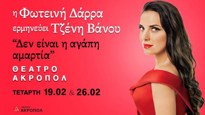 Η παράσταση που έσπασε ταμεία σε Βόλο και Θεσσαλονίκη για τη ζωή και το έργο της Τζένης Βάνου με τίτλο «Δεν είναι η αγάπη αμαρτία» έρχεται στην Αθήνα! Για δύο συνεχόμενες Τετάρτες στις 19 και στις 26 Φεβρουαρίου το θέατρο Ακροπόλ υποδέχεται τη Φωτεινή Δάρρα για μια μοναδική παράσταση-κατάθεση ψυχής! Μέσα από έναν μουσικοθεατρικό μονόλογο […]
