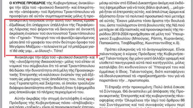 Πανικό και οργή στο Μαξίμου έχει προκαλέσει η αποκάλυψη του Μανώλη Κοττάκη στην εφημερίδα «Εστία» για τις καταγγελίες υπαλλήλων της Περιφέρειας Λάρισας ότι άκουγαν Υπουργό να ωρύεται σε τηλεφωνική επικοινωνία ενώπιον του Χρήστου Τριαντόπουλου, να τελειώσουν άμεσα με το μπάζωμα του σημείου της τραγωδίας των Τεμπών. Μάλιστα, σύμφωνα με το ρεπορτάζ «βόμβα», ο «Γηραιός» Υπουργός […]