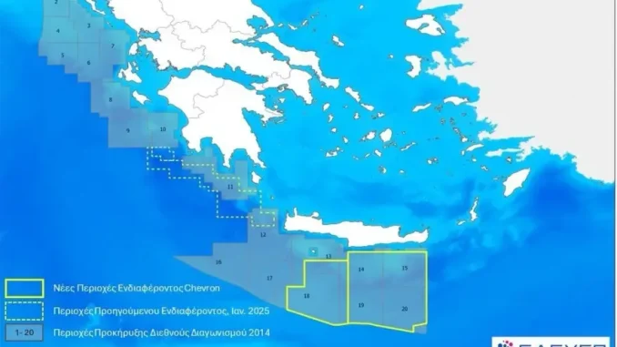 Tην αποδοχή από την κυβέρνηση του ενδιαφέροντος που έχει εκδηλώσει η Chevron για έρευνες για κοιτάσματα υδρογονανθράκων για τις θαλάσσιες περιοχές Νότια Κρήτη Ι και Νότια Κρήτη ΙΙ, εντός των περιοχών που είχαν οριοθετηθεί με την προκήρυξη του διεθνούς διαγωνισμού το 2014, ανακοίνωσε την Τετάρτη το υπουργείο Περιβάλλοντος και Ενέργειας.