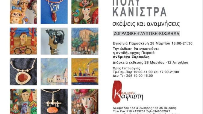 Την έκθεση με τίτλο «Σκέψεις & αναμνήσεις» θα εγκαινιάσει η αντιδήμαρχος Πειραιά Ανδριάνα Ζαρακέλη την Παρασκευή 28 Μαρτίου (18.00 μ.μ.).
