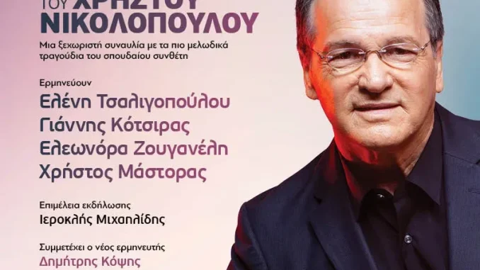 Την Παρασκευή 16 Μαΐου 2025 Προπώληση εδώ Ο Χρήστος Νικολόπουλος, ένας από τους μεγαλύτερους συνθέτες μας και από τα σημαντικότερα πρόσωπα της σύγχρονης μουσικής μας ιστορίας παρουσιάζει μια συναυλία – γιορτή την Παρασκευή 16 Μαΐου, στο Christmas Theater. Ένα μεγάλο καλλιτεχνικό γεγονός, καθώς για πρώτη φορά θα ακουστούν οι ερωτικές μπαλάντες του συνθέτη, σε μια […]
