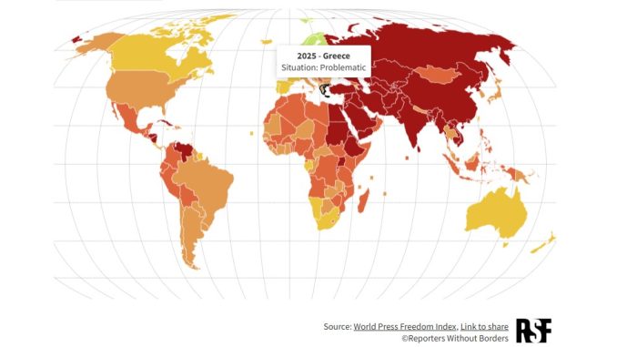 Την 89η θέση κατέλαβε για το 2025 η Ελλάδα στην ετήσια παγκόσμια κατάταξη των Ρεπόρτερ Χωρίς Σύνορα (RSF), με αποτέλεσμα να παραμείνει για τέταρτη συνεχόμενη χρονιά η χειρότερη χώρα στην ΕΕ σε ό,τι αφορά την ελευθερία του Τύπου, έχοντας υποχωρήσει μάλιστα μία θέση σε σχέση με πέρυσι (88η θέση). Όπως μάλιστα παρατηρούν οι RSF, «το […]