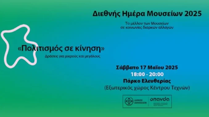 Ο Οργανισμός Πολιτισμού, Αθλητισμού και Νεολαίας Δήμου Αθηναίων στο πλαίσιο της Διεθνούς Ημέρας Μουσείων 2025 διοργανώνει, το Σάββατο 17 Μαΐου 2025 στο Πάρκο Ελευθερίας (εξωτερικός χώρος Κέντρου Τεχνών), την εκδήλωση «Πολιτισμός σε Κίνηση», προσκαλώντας παιδιά και ενήλικες να συμμετέχουν σε μια σειρά πολιτιστικών και καλλιτεχνικών δράσεων. Η Διεθνής Ημέρα Μουσείων, που τιμάται κάθε χρόνο στις […]