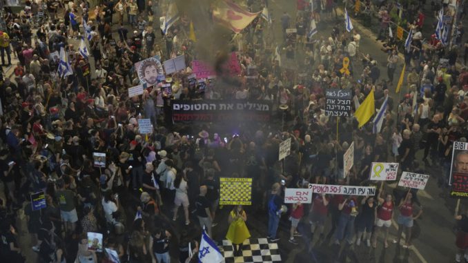 Το πλήθος κατέκλυσε την «Πλατεία των Ομήρων», στο κέντρο του Τελ Αβίβ. Πολλοί κρατούσαν ισραηλινές σημαίες και φωτογραφίες των Ισραηλινών που απήχθησαν από τη Χαμάς κατά την πρωτοφανή, αιματηρή επίθεσή της στο ισραηλινό έδαφος στις 7 Οκτωβρίου 2023. Με αφορμή εκείνη την επίθεση, η κυβέρνηση του Μπενιαμίν Νετανιάχου εξαπέλυσε μια στρατιωτική επιχείρηση με δεδηλωμένο στόχο να εξοντώσει την οργάνωση και να απελευθερώσει τους ομήρους.