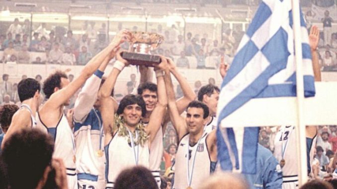 Ο Χρήστος Σαρτζετάκης, ΠτΔ, ο Ανδρέας Παπανδρέου Πρωθυπουργός και ο Κωνσταντίνος Μητσοτάκης Αρχηγός της Αξιωματικής Αντιπολίτευσης κάθονται στην πρώτη σειρά στο ΣΕΦ στον αγώνα που η Εθνική μας Ομάδα Μπάσκετ κατέκτησε τον πρώτο της ιστορικό τίτλο, του Ευρωμπάσκετ του 1987.