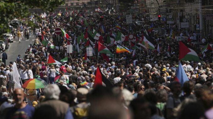 Μαζική κινητοποίηση αλληλεγγύης προς τον παλαιστινιακό άμαχο πληθυσμό οργάνωσαν σήμερα το απόγευμα στην Ιταλία και πιο συγκεκριμένα στη Ρώμη τα τρία μεγαλύτερα κόμματα της ιταλικής αντιπολίτευσης. Το Δημοκρατικό Κόμμα, τα Πέντε Αστέρια, η Ιταλική Αριστερά με τους οικολόγους, συνδικάτα και οργανώσεις της κοινωνίας των πολιτών ζήτησαν να τερματιστούν άμεσα οι επιχειρήσεις του ισραηλινού στρατού στην Λωρίδα της Γάζας.