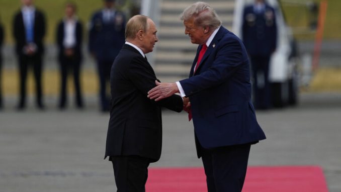President Donald Trump talks with Russia’s President Vladimir Putin Friday, Aug. 15, 2025, at Joint Base Elmendorf-Richardson, Alaska. (AP Photo/Julia Demaree Nikhinson)