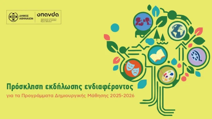Πρόσκληση εκδήλωσης ενδιαφέροντος για την υλοποίηση σεμιναρίων και εργαστήριων στα Κέντρα Δημιουργικής Μάθησης του Δήμου Αθηναίων Ο Οργανισμός Πολιτισμού, Αθλητισμού και Νεολαίας του Δήμου Αθηναίων (ΟΠΑΝΔΑ) πρόκειται να υλοποιήσει από τον Νοέμβριο 2025 έως και τον Μάιο 2026 σεμινάρια και εργαστήρια δημιουργικής μάθησης για παιδιά και ενήλικες, στα Κέντρα Δημιουργικής Μάθησης. Για τον σκοπό αυτό, […]