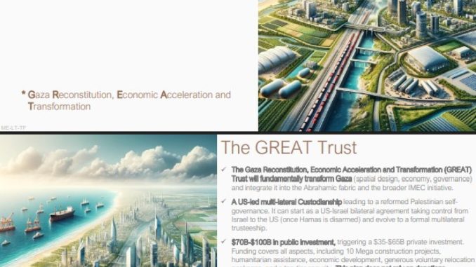 Ένα σχέδιο για την μεταπολεμική Λωρίδα της Γάζας κυκλοφορεί στους κύκλους της αμερικανικής κυβέρνησης του προέδρου Ντόναλντ Τραμπ, το οποίο προβλέπει την αμερικανική διοίκηση του κατεστραμμένου από τον πόλεμο παλαιστινιακού θύλακα για τουλάχιστον μια δεκαετία, την προσωρινή μετεγκατάσταση του πληθυσμού της Γάζας και την ανοικοδόμηση του παράκτιου παλαιστινιακού θύλακα σε ένα τουριστικό θέρετρο και βιομηχανικό κόμβο, αναφέρει αναλυτικά σημερινό δημοσίευμα της Washington Post.